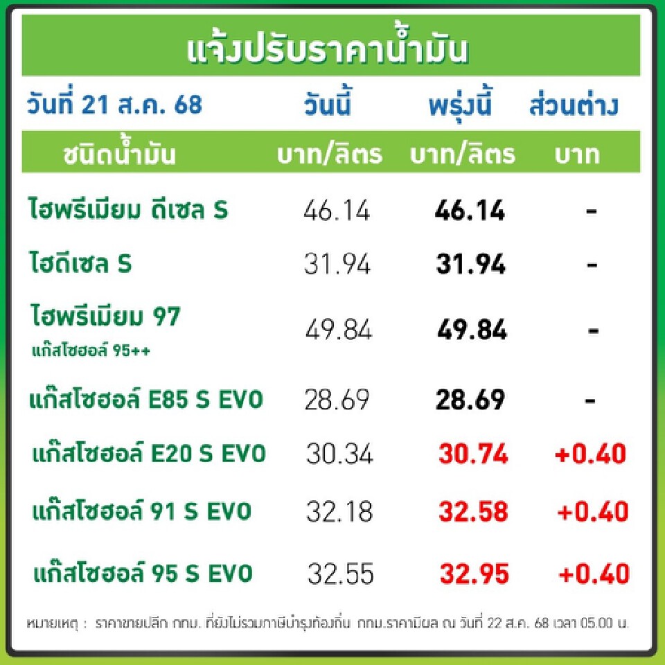 - การปรับราคาครั้งล่าสุดเกิดขึ้นเมื่อวันที่ 22 ส.ค. 68 โดยปรับขึ้นเฉพาะกลุ่มน้ำมันเบนซินและแก๊สโซฮอล์ 40 สตางค์ต่อลิตร