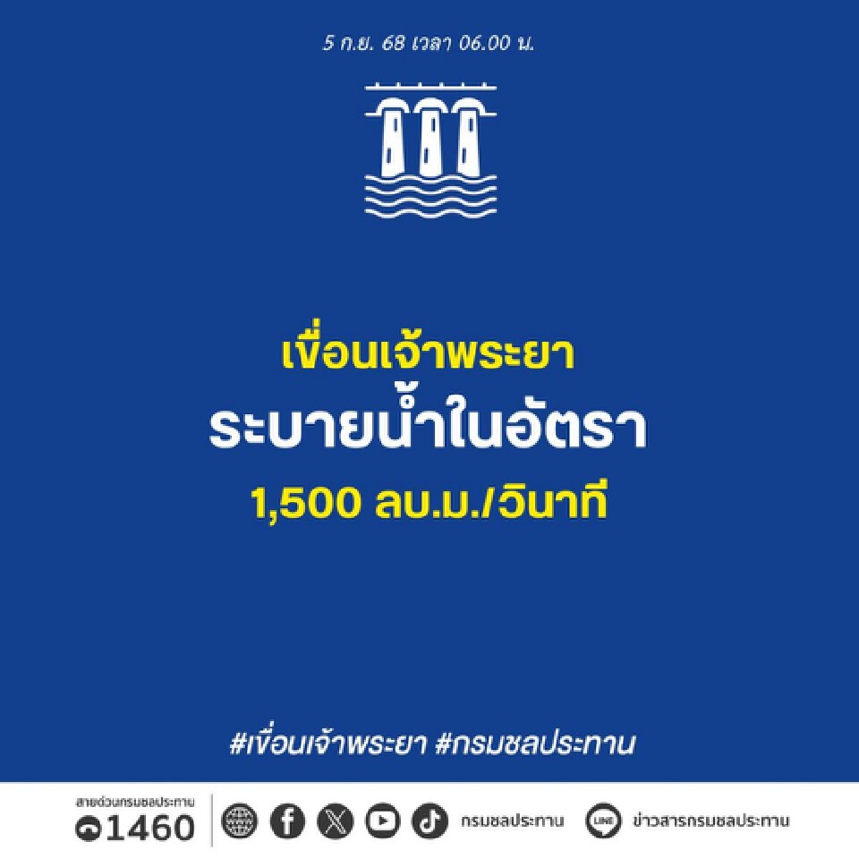 สถานการณ์น้ำเจ้าพระยาในช่วงเช้าของวันนี้ 5 กันยายน 2568 ณ เวลา 06.00 น.