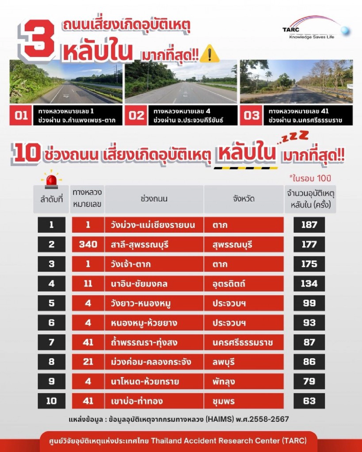 ศูนย์วิจัยอุบัติเหตุแห่งประเทศไทย (TARC) เปิดเผยสถิติอุบัติเหตุจากการขับรถ "หลับใน" บนท้องถนนไทยตลอดช่วงเวลา 10 ปี (พ.ศ. 2558–2567) โดยใช้ข้อมูลจากระบบฐานข้อมูลอุบัติเหตุของกรมทางหลวง (HAIMS) พบว่า มีหลายเส้นทางที่เป็นจุดเสี่ยงสูง โดยเฉพาะถนนตรงยาวที่มีการจราจรหนาแน่นจากรถบรรทุกและรถโดยสาร