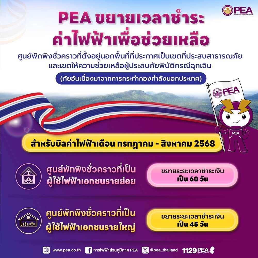 PEA ขยายระยะเวลา ชำระเงินค่าไฟฟ้า สำหรับศูนย์พักพิงชั่วคราว ที่ตั้งอยู่นอกพื้นที่ที่ประกาศเป็นเขตสาธารณภัยฯ ประจำเดือนกรกฎาคม – สิงหาคม 2568