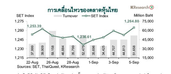 บริษัทหลักทรัพย์ (บล.)กสิกรไทย(KSecurities) มองว่าสัปดาห์ถัดไป (8-12 ก.ย. 68) ดัชนีหุ้นไทยมีแนวรับที่ 1,240 และ 1,225 จุด ขณะที่แนวต้านอยู่ที่ 1,270 และ 1,285 จุด ตามลำดับ โดยในวันศุกร์ที่ 5 ก.ย. 2568 ดัชนี SET ปิดที่ระดับ 1,264.80 จุด เพิ่มขึ้น 2.28% จากระดับปลายสัปดาห์ก่อน ขณะที่มูลค่าการซื้อขายเฉลี่ยต่อวันอยู่ที่ 42,259.94 ล้านบาท ลดลง 9.79% จากสัปดาห์ก่อน ส่วนดัชนี mai เพิ่มขึ้น 1.40% มาปิดที่ระดับ 252.34 จุด