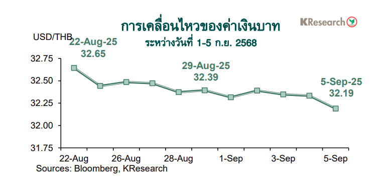 ในวันศุกร์ที่ 5 ก.ย. 2568 เงินบาทปิดตลาดในประเทศที่ 32.19 บาทต่อดอลลาร์ฯ เทียบกับระดับ 32.39 บาทต่อดอลลาร์ฯ ในวันศุกร์ก่อนหน้า (29 ส.ค.) สำหรับสถานะพอร์ตการลงทุนของนักลงทุนต่างชาติระหว่างวันที่ 25-29 ส.ค. 2568 นั้น นักลงทุนต่างชาติซื้อสุทธิหุ้นไทย 689 ล้านบาท แต่มีสถานะอยู่ในฝั่ง Net Outflows ออกจากตลาดพันธบัตรไทย 2,130 ล้านบาท (ขายสุทธิพันบัตร 1,029 ล้านบาท และตราสารหนี้หมดอายุ 1,102 ล้านบาทตามลำดับ