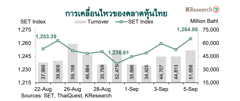 อย่างไรก็ดี ดัชนีหุ้นไทยย่อตัวลงช่วงสั้น ๆ ระหว่างสัปดาห์ตามแรงขายทำกำไรของต่างชาติโดยเฉพาะในหุ้นกลุ่มเทคโนโลยี ก่อนจะดีดตัวขึ้นอีกครั้งช่วงท้ายสัปดาห์ตามทิศทางตลาดหุ้นต่างประเทศ โดยมีปัจจัยหนุนจากคาดการณ์เรื่องการปรับลดดอกเบี้ยนโยบายของเฟดในรอบการประชุมเดือนก.ย. นี้ ท่ามกลางสัญญาณที่อ่อนแอของตลาดแรงงานสหรัฐฯ นอกจากนี้ การโหวตนายกรัฐมนตรีคนใหม่ในช่วงท้ายสัปดาห์ก็เป็นอีกปัจจัยหนุนตลาดหุ้นไทยด้วยเช่นกัน