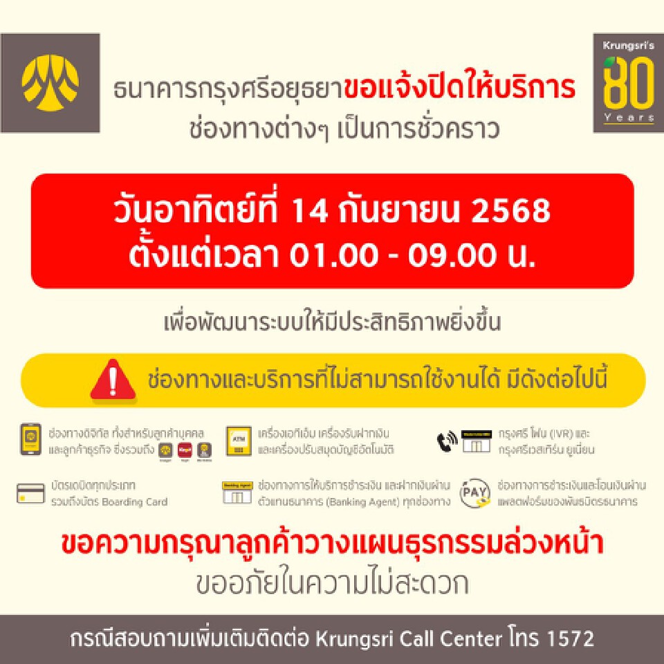 ธนาคารกรุงศรีอยุธยา แจ้งปิดให้บริการ ช่องทางต่างๆ เป็นการชั่วคราว วันอาทิตย์ที่ 14 กันยายน 2568 ตั้งแต่เวลา 01.00 – 09.00 น. เพื่อพัฒนาระบบให้มีประสิทธิภาพยิ่งขึ้น โดยช่องทางและบริการที่ไม่สามารถใช้งานได้ มีดังต่อไปนี้