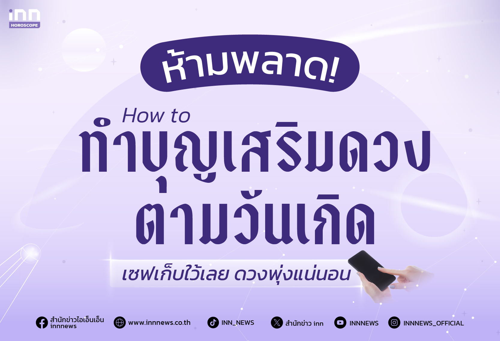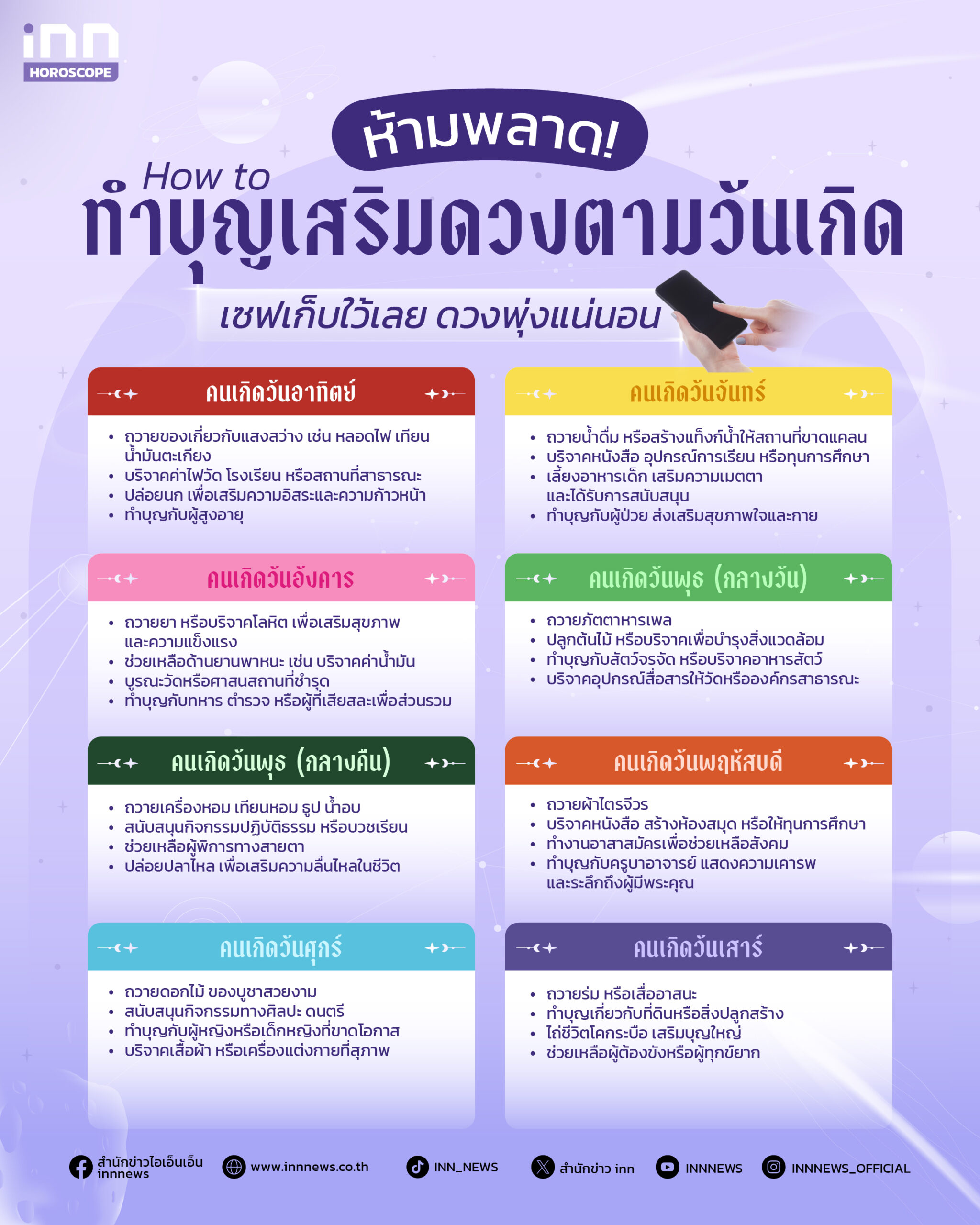 และทั้งหมดนี้ก็คือ “วิธีทำบุญเสริมดวงตามวันเกิด” ที่จะช่วยเปิดพลังดีให้ชีวิตเดินหน้าอย่างมั่นคง ไม่ว่าคุณจะเกิดวันไหน แค่ทำบุญด้วยจิตศรัทธาและตั้งใจ ผลบุญก็พร้อมย้อนกลับมาหนุนเส้นทางชีวิตให้สดใส ราบรื่น และเฮงยิ่งกว่าเดิม และถ้าใครชอบดูดวง เสริมดวง เสริมโชคลาภในแบบอื่น ๆ อย่าลืมติดตามเราได้ที่ iNN Horoscope