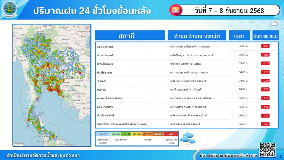 สำหรับปริมาณฝนตก 24 ชั่วโมงที่ผ่านมา พบว่ามีปริมาณฝนสูงสุด 3 อันดับ ได้แก่