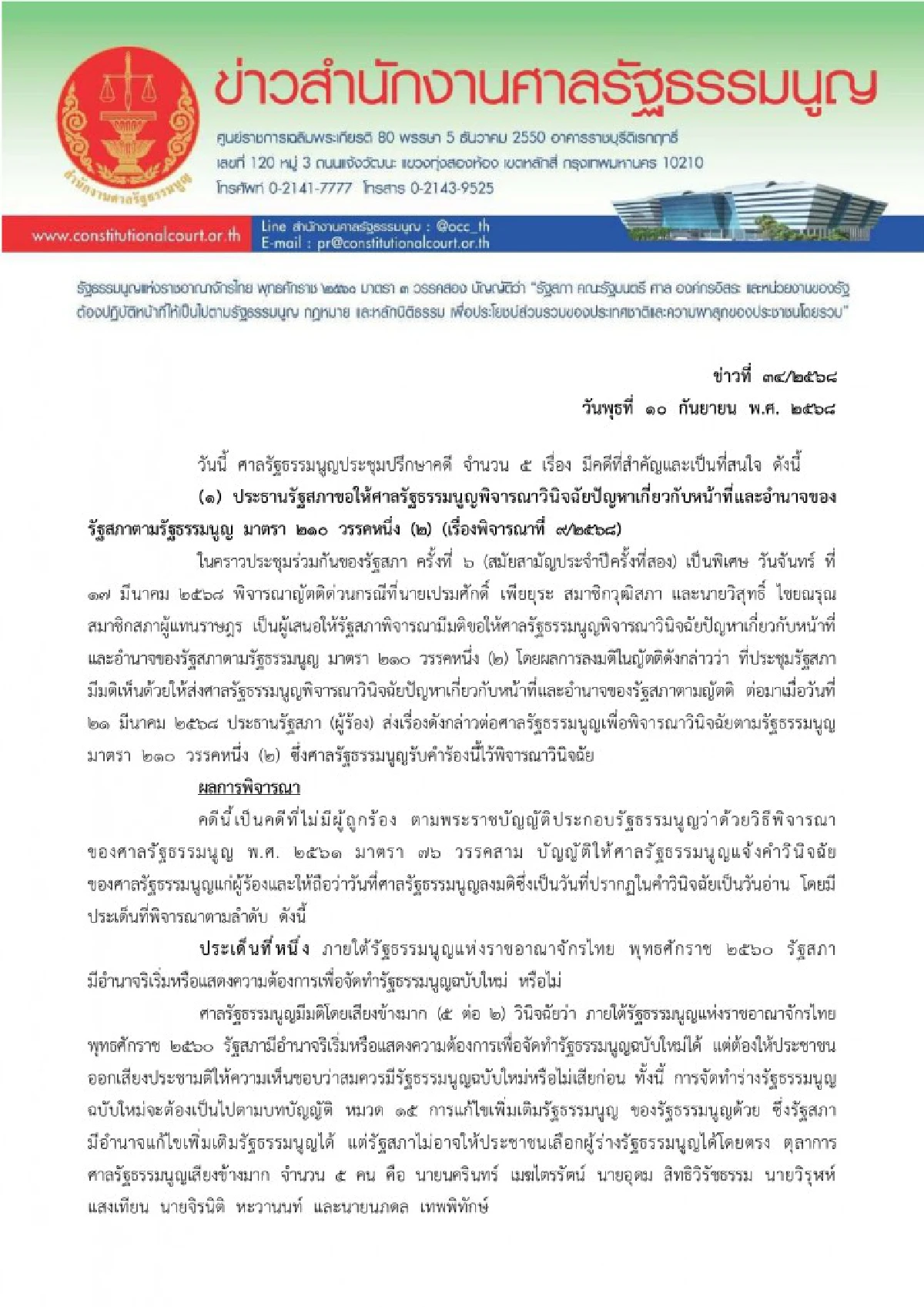 เมื่อวันที่ 10 ก.ย. ศาลรัฐธรรมนูญประชุมปรึกษาคดีรวม 5 เรื่อง โดยมีคดีสำคัญคือกรณีที่ประธานรัฐสภาขอให้วินิจฉัยอำนาจรัฐสภาในการจัดทำรัฐธรรมนูญฉบับใหม่ ตามรัฐธรรมนูญมาตรา 210 วรรคหนึ่ง (2)