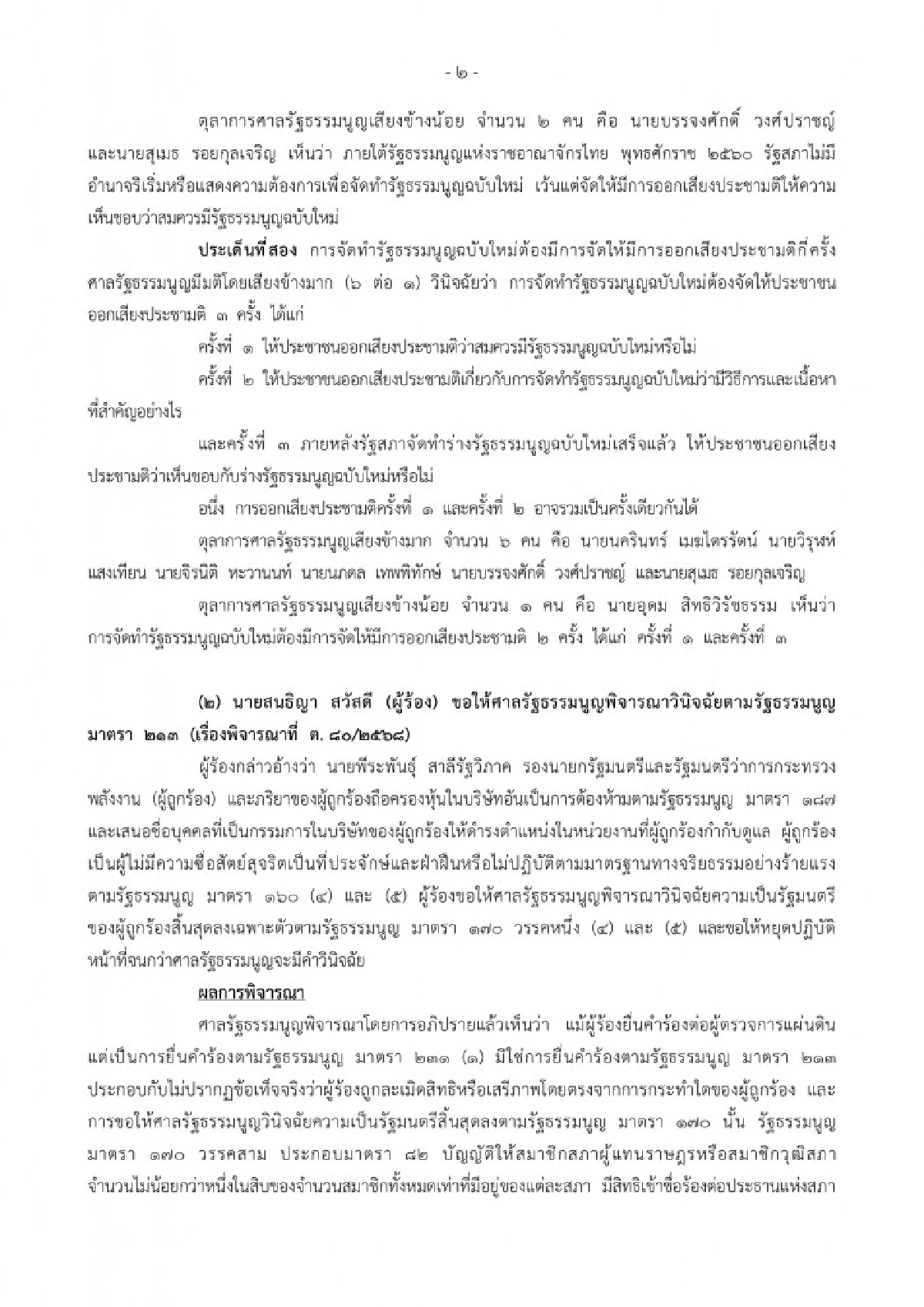ศาลมีมติ 5 ต่อ 2 วินิจฉัยว่า รัฐสภามีอำนาจริเริ่มหรือแสดงความต้องการจัดทำรัฐธรรมนูญฉบับใหม่ได้ แต่ต้องผ่านการทำประชามติให้ประชาชนเห็นชอบเสียก่อน โดยการดำเนินการต้องอยู่ภายใต้หมวด 15 การแก้ไขเพิ่มเติมรัฐธรรมนูญ ทั้งนี้ รัฐสภาไม่อาจให้ประชาชนเลือกผู้ร่างรัฐธรรมนูญโดยตรง