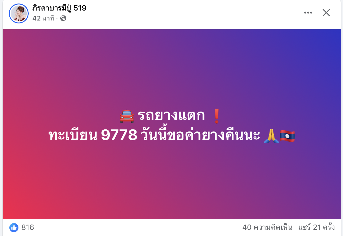 ในโพสต์ดังกล่าวมีข้อความระบุว่า “รถยางแตก ทะเบียน 9778 วันนี้ขอค่ายางคืนนะ”
