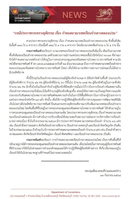 กรมราชทัณฑ์ เผยแพร่เอกสารชี้แจง ปรับอาณาเขตพื้นที่ เรือนจำกลางคลองเปรม ลดความแออัด เหตุผู้ต้องขังมีจำนวนมาก