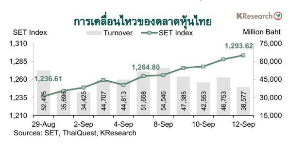 ศูนย์วิจัยกสิกรไทย (KResearch) ประเมินปัจจัยสำคัญที่ต้องติดตาม ได้แก่ การประชุมเฟด (16-17 ก.ย.)ประเด็นการเมืองในประเทศ รวมถึงทิศทางเงินทุนต่างชาติ ส่วนข้อมูลเศรษฐกิจสหรัฐฯ ที่สำคัญ ได้แก่ ยอดค้าปลีก ผลผลิตภาคอุตสาหกรรมและข้อมูลการเริ่มสร้างบ้านเดือนส.ค. รวมถึงจำนวนผู้ขอรับสวัสดิการว่างงานรายสัปดาห์