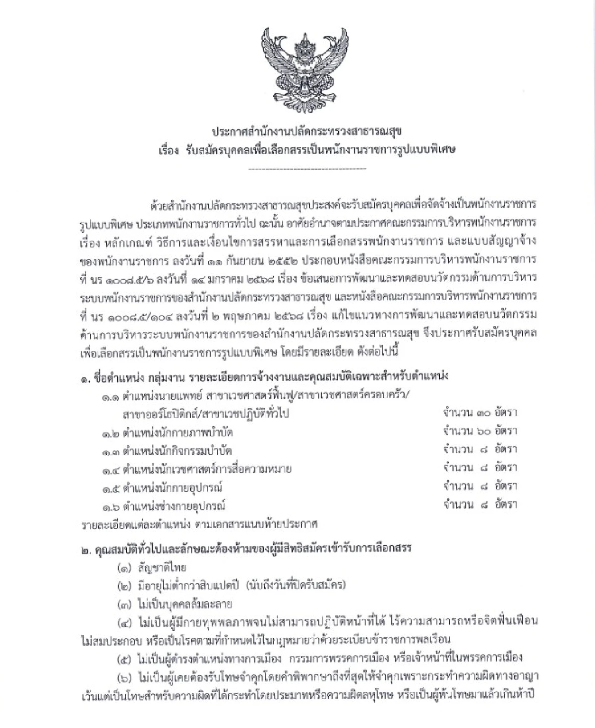 ประกาศสำนักงานปลัดกระทรวงสาธารณสุข เรื่อง รับสมัครบุคคลเพื่อเลือกสรรเป็นพนักงานราชการรูปแบบพิเศษ ฉบับเต็ม (คลิก)