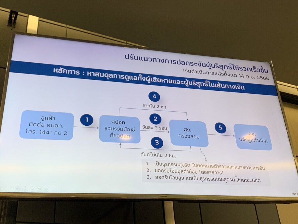นางสาวดารณี กล่าวว่า สำหรับแนวทางการแก้ไขระงับธุรกรรมในเส้นเงิน และกระบวนการปลดระงับ เพื่อลดผลกระทบต่อผู้บริสุทธิ์โดยเร็ว แต่ต้องดูแลเหยื่อให้ได้รับความช่วยเหลือที่เหมาะสมด้วยนั้น ขณะนี้ ธปท.ได้ให้ธนาคารพาณิชย์ลดระยะเวลาการปลดการระงับให้เร็วขึ้น โดยไม่ต้องรอให้ถึง 72 ชั่วโมง หรือ 7 วันแล้วแต่กรณี ตามที่กำหนดใน พ.ร.ก. โดยธนาคารพาณิชย์จะต้องตรวจสอบข้อมูลของผู้ได้รับผลกระทบที่ได้รับจาก ศปอท.โดยเร็วที่สุดไม่เกินกว่า 2 ชั่วโมง (วันละ 3 รอบ เวลา 11.00 น. 15.00 น. และ 19.00 น.) ซึ่งจะใช้เวลานานสุดไม่เกิน 4 ชั่วโมง และหากส่งคำร้องเรียนมาก่อน 19.00 น. จะพยายามดำเนินการให้เสร็จในสิ้นวัน เพื่อส่งกลับให้ศปอท. ประมวลผล และส่งกลับมาแจ้งธนาคารพาณิชย์ เพื่อปลดการระงับธุรกรรม เร่งปรับการแจ้งผู้ถูกระงับธุรกรรมให้มีความชัดเจน ถึงลักษณะการถูกระงับและสิ่งที่ผู้ได้รับผลกระทบนั้นต้องทำต่อ และให้เป็นมาตรฐานยิ่งขึ้น