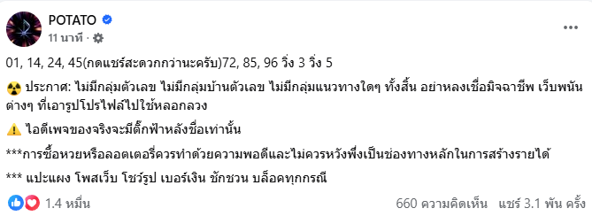ล่าสุดก่อนหวยออกในช่วงโค้งสุดท้าย เพจ POTATO โพสต์ระบุว่า 01, 14, 24, 45 (กดแชร์สะดวกกว่านะครับ) 72, 85, 96 วิ่ง 3 วิ่ง 5
