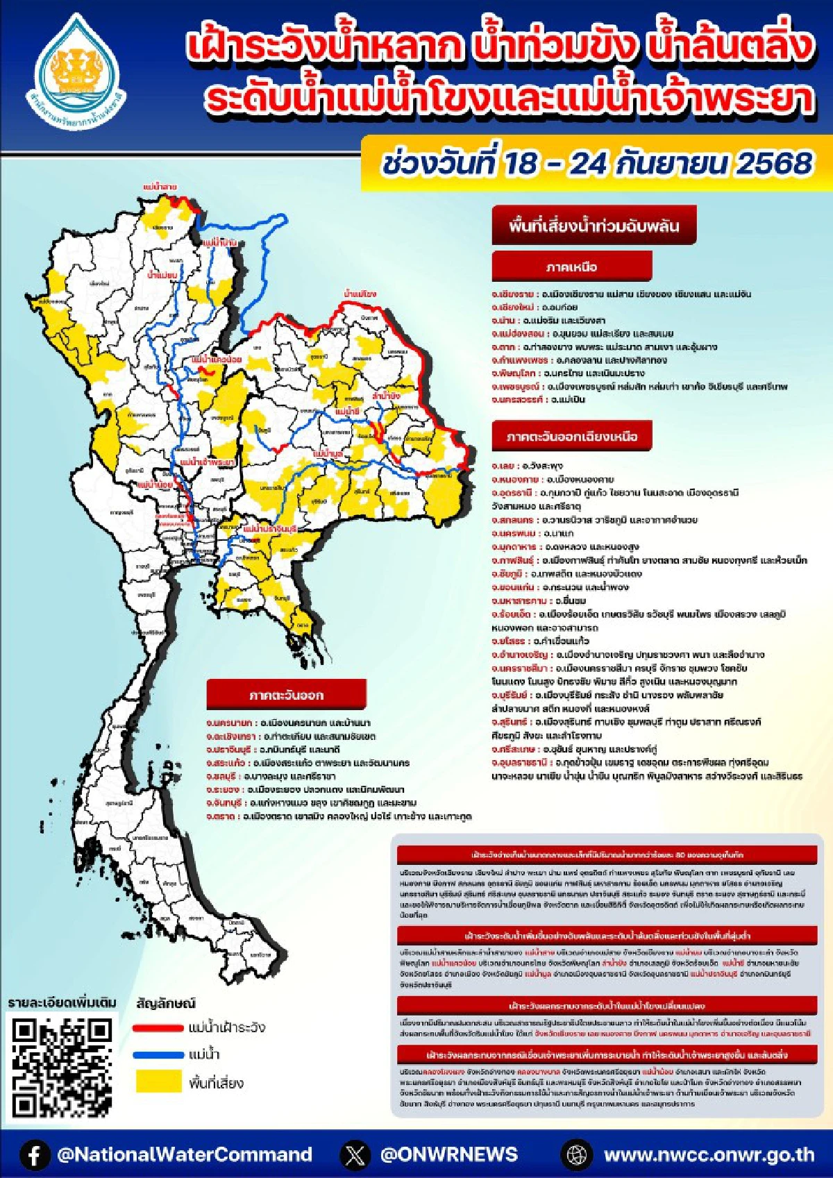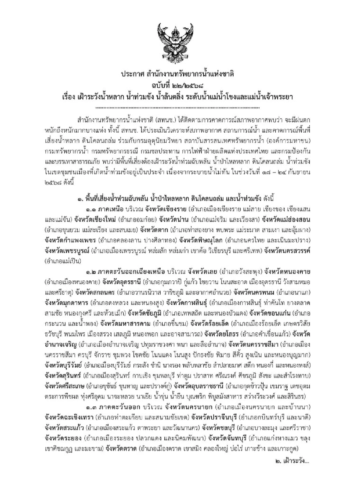 สำนักงานทรัพยากรน้ำแห่งชาติ ประกาศ ฉบับที่ 22/2568 เรื่อง เฝ้าระวังน้ำหลาก น้ำท่วมขัง น้ำล้นตลิ่ง ระดับน้ำแม่น้ำโขงและแม่น้ำเจ้าพระยา