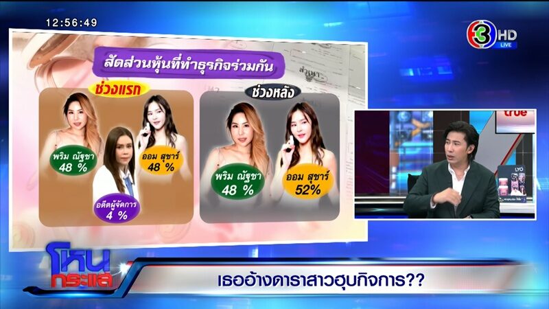 ศสา : พริมก็ชัดเจนมาเลยตั้งแต่เดย์วัน พี่ศสา ถ้าหนูจะทำธุรกิจ หนูขอหุ้นใหญ่กว่าอีกฝั่งนึงนะคะ ส่วนเรา เราน้อมรับหุ้นเล็กกว่าอยู่แล้ว เพราะเราเข้าใจ พริมบอกหนูชัดเจนว่าขอเป็นหุ้นใหญ่ แต่น้องนักแสดงก็เคยบอกศสาเหมือนกันว่าถ้าเขาจะทำ เขาขอเป็นหุ้นใหญ่เหมือนกัน แต่หลังจากที่เราบอกว่ามันไม่ได้จริงๆ ทางนี้มีความชัดเจนก่อนเรานัดให้มาเจอกัน ไม่งั้นเขาขอไม่ทำ ทางนักแสดงก็โอเค ยอมหุ้นน้อยกว่า