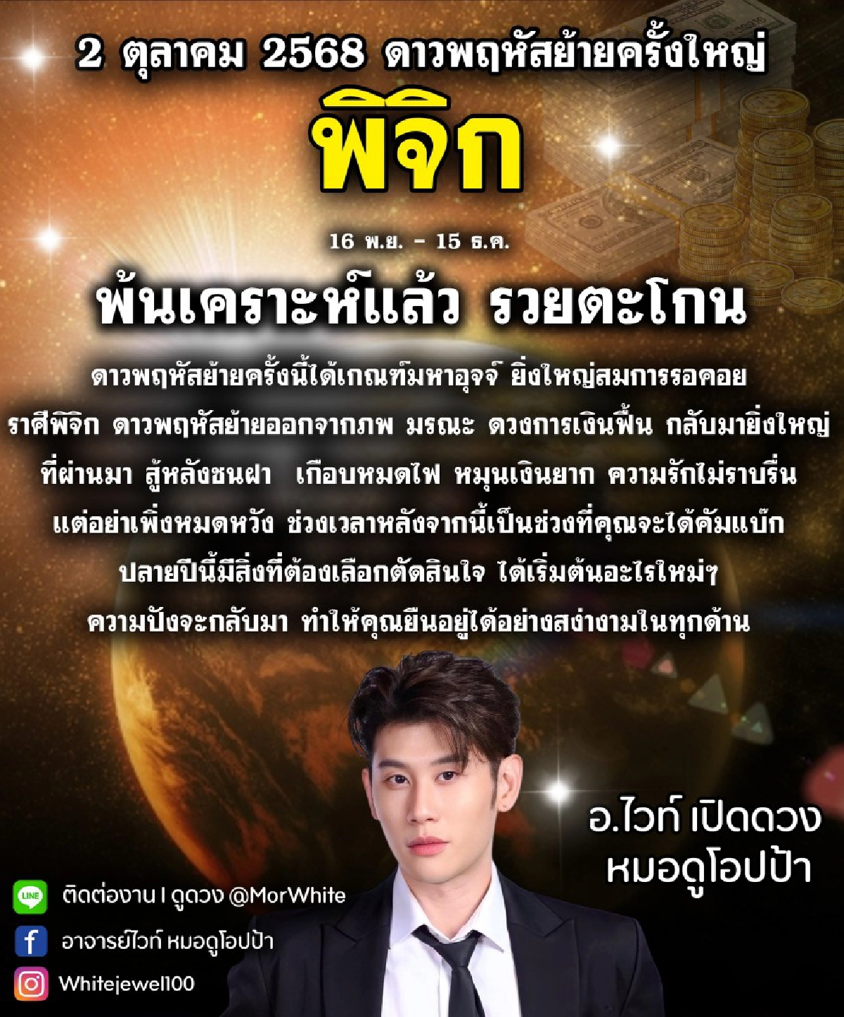 "หมอไวท์" ดูดวงวันนี้ 1 ราศี พ้นเคราะห์ ดวงการเงินฟื้นกลับมายิ่งใหญ่ รวยตะโกน หลังดาวพฤหัสย้ายครั้งใหญ่ 2 ต.ค. 2568