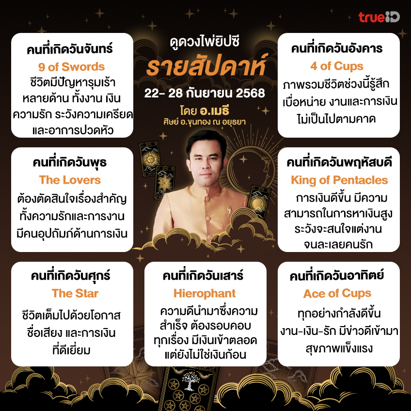 เปิดดวงไพ่ยิปซี รายสัปดาห์ ช่วงวันที่ 22- 28 กันยายน 2568 สัปดาห์นี้คนเกิดวันไหนที่ "มีผู้ใหญ่หรือคนรักอุปถัมภ์ด้านการเงิน" และดวงคนเกิดวันอื่นๆ จะดีด้านใดกันบ้าง หรือมีประเด็นอะไรต้องระวังเป็นพิเศษ มา ดูดวงรายสัปดาห์ กับ อ.เมธี ศิษย์ อ.ขุนทอง ณ อยุธยา 0915945646 กันเลยได้ มีคำทำนายมาให้ครบ! สำหรับคนเกิดทั้ง 7 วัน ทั้ง ดวงการงาน ดวงการเงิน ดวงความรัก และ ดวงสุขภาพ