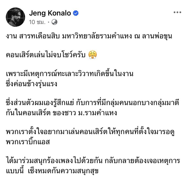 เจ๋ง บิ๊กแอส โพสต์เดือด! จวกนักเลงตีกันกลางคอนเสิร์ตสารทเดือนสิบ ม.ราม เล่นไม่จบโชว์-ขอโทษผู้จัด