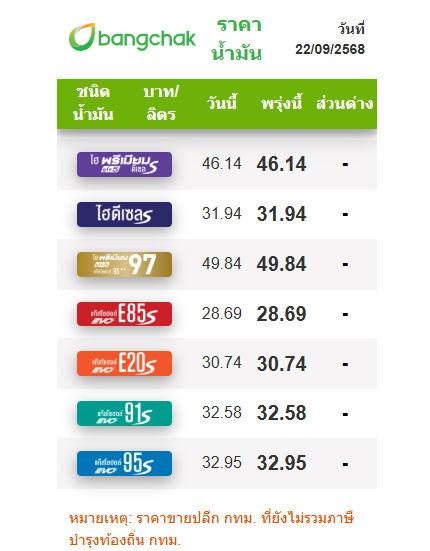 หมายเหตุ : ราคาอ้างอิงจาก บมจ.บางจากฯ ควรตรวจสอบราคา ณ สถานีเติมน้ำมันอีกครั้ง ราคาข้างต้นยังไม่รวมภาษีบำรุงท้องที่ กทม. ราคาพรุ่งนี้จะมีผลตั้งแต่เวลา 05.00 น.