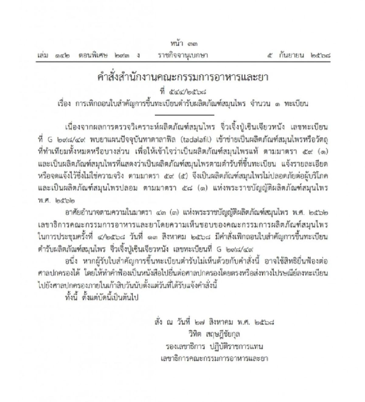 วันที่ 22 ก.ย. เพจเฟซบุ๊ก สภาเภสัชกรรม : The Pharmacy Council ประกาศเตือนประชาชน หลัง สำนักงานคณะกรรมการอาหารและยา (อย.) มีคำสั่งเพิกถอนทะเบียนตำรับยา "จิ่วเจิ้งปู่เซินเจียนเจียวหนัง" (เลขทะเบียน G298/49) หลังตรวจพบมีส่วนผสมของ สารทาดาลาฟิล (Tadalafil) ซึ่งเป็นยารักษาโรคเสื่อมสมรรถภาพทางเพศ หากรับประทานโดยไม่อยู่ในการดูแลของแพทย์หรือเภสัชกร อาจทำให้เกิดอันตรายถึงชีวิต