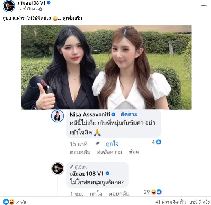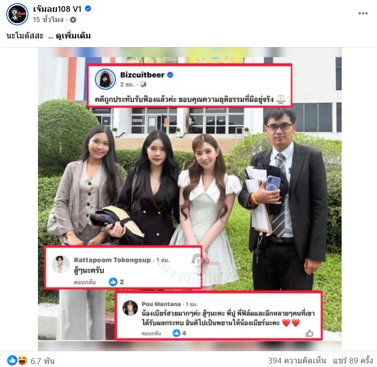ขณะที่ก็มีคนแชร์โพสต์ เพจ เจ๊มอย108 v1 ที่แคปโพสต์ของสาวเบียร์ ภัสรนันท์ แล้วมีคนเข้าไปคอมเมนต์ สู้ๆ ด้วย พร้อมทั้งคอมเมนต์ตั้งข้อสงสัยว่า “ต้นเรื่อง..น่าจะใช่แหล่ะ”