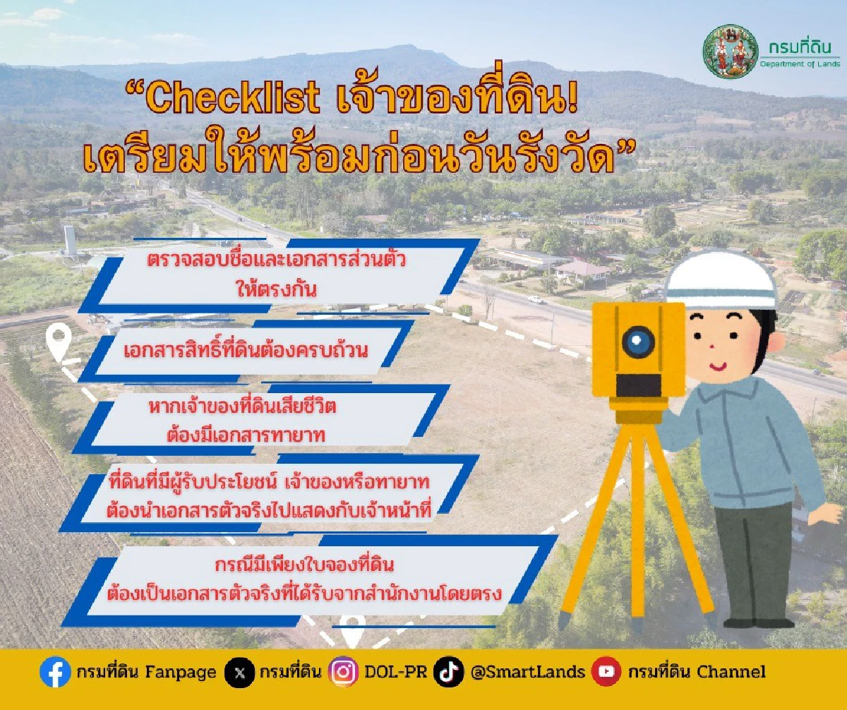 ข้อควรรู้ “กรมที่ดิน” แนะขั้นตอน เตรียมตัวก่อนรังวัดที่ดิน คู่มือเข้าใจง่ายสำหรับเจ้าของที่ดิน เอกสารที่ต้องใช้ในการดำเนินงาน