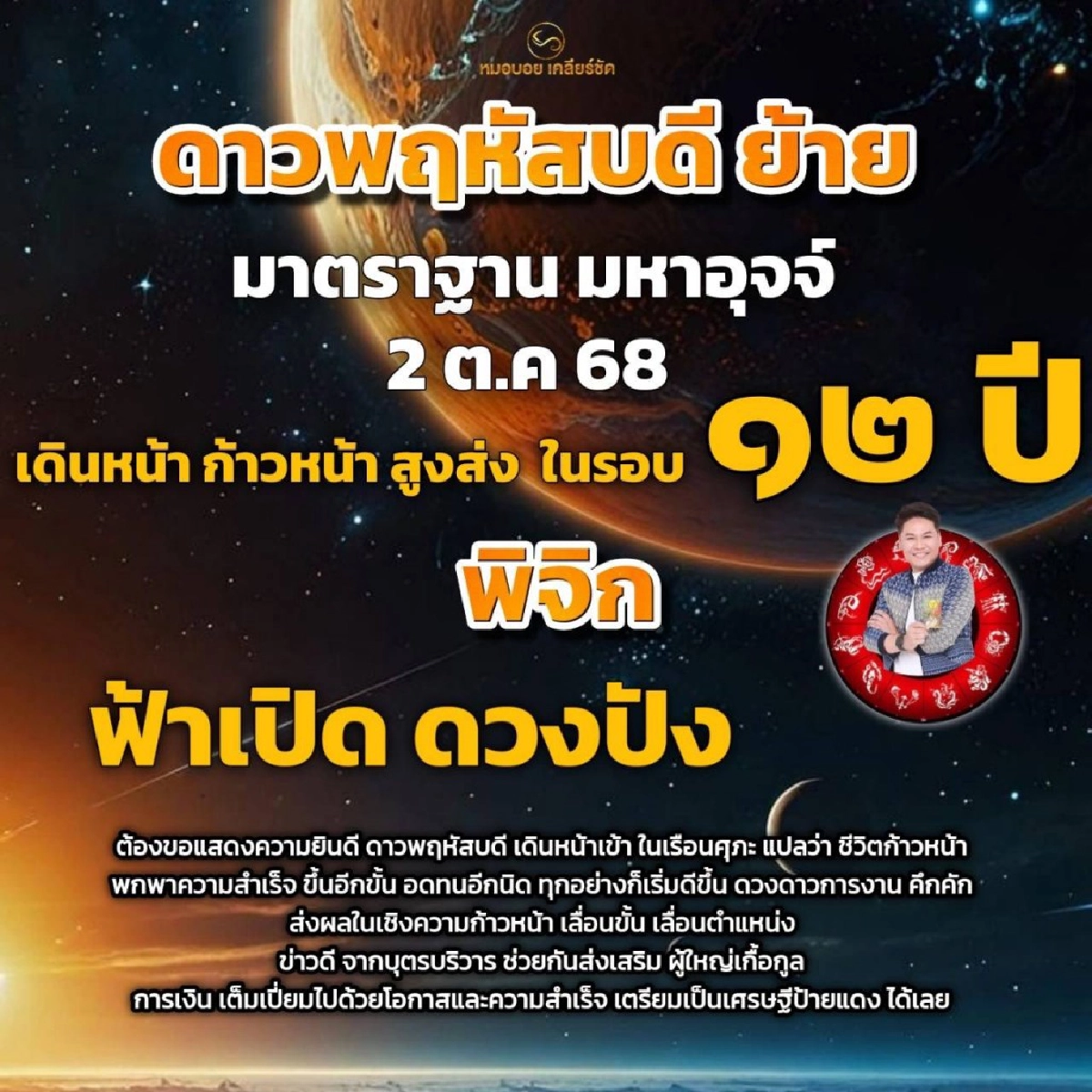 เพจเฟซบุ๊ก หมอบอย เคลียร์ชัด เผยคำทำนายระบุว่า ดาวพฤหัสย้าย มาตราฐานมหาอุจจ์ 2 ต.ค. 68 เดินหน้า ก้าวหน้า สูงส่งในรอบ 12 ปี