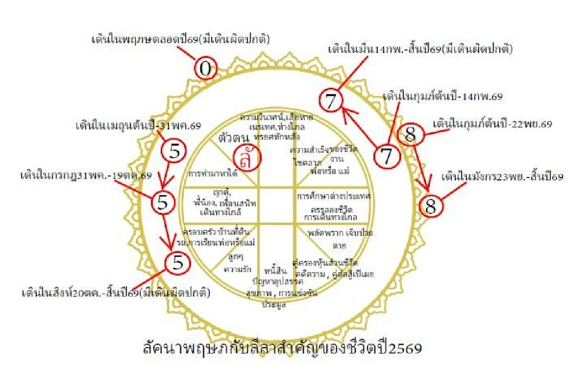6. ตั้งแต่ 22 พฤศจิกายน - สิ้นปี 2569 - ยาวนานสิบแปดเดือน เตรียมรับลาภชั่วในชีวิต โดยเฉพาะเรื่องงาน หรือนาย หรือกิจการ พร้อมอาจมีเรื่องกับผู้ใหญ่ ตามโฉลก…ได้ลาภชั่ว ผู้เฒ่าตัวกล่าวมายา… (พระราหูจร 8 เดินในราศีมังกร - ภพที่เก้า - ศุภะ) ซึ่งลาภชั่วนี้คงจะไม่ธรรมดาแน่นอน รอดูเถอะ (ราหูจรที่ราศีมังกร - มหาจักร)