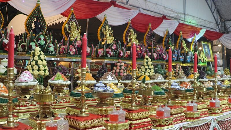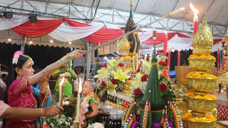 ต่างเดินทางกันมาที่ทำพิธีนำบายศรีไหว้ครูบาอาจารย์ที่เคารพนับเพื่อความเป็นสิริมงคล ในงานได้มีผู้ถูกสลากรางวัลเมื่องวดที่ผ่านมา แต่งชุดไทยสวยงามมารำแก้บนถวายในงานพิธีดังกล่าว