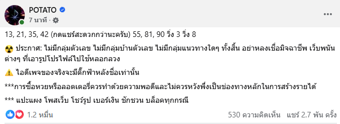 ล่าสุดก่อนหวยออกในช่วงโค้งสุดท้าย เพจ POTATO โพสต์ระบุว่า 13, 21, 35, 42 (กดแชร์สะดวกกว่านะครับ) 55, 81, 90 วิ่ง 3 วิ่ง 8