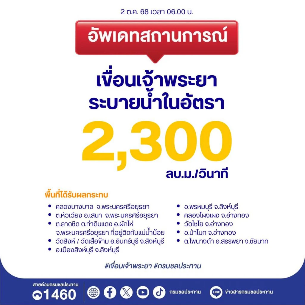 - คาดการณ์ว่าการระบายน้ำจากเขื่อนจะทำให้ระดับน้ำในแม่น้ำเจ้าพระยาสูงขึ้น โดยต้องเฝ้าระวังเป็นพิเศษในวันที่ 9-10 ตุลาคม