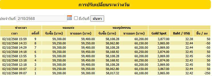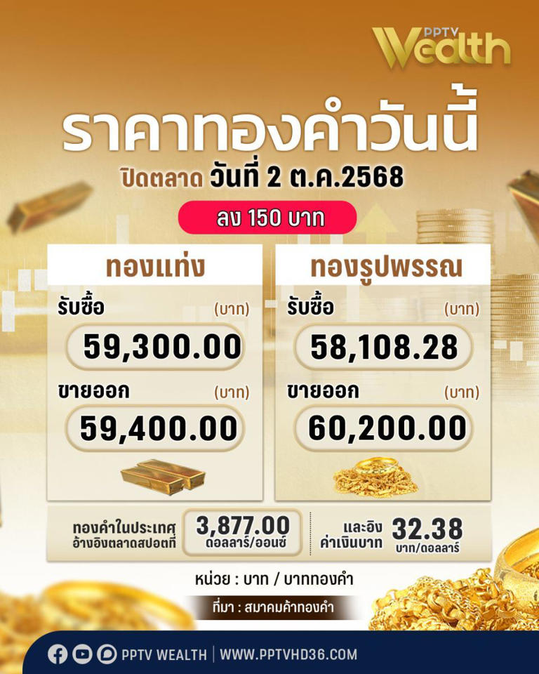 สมาคมค้าทองคำ ประกาศ ราคาทองวันพฤหัสบดีที่ 3 ตุลาคม 2568 ปิดการซื้อขาย "ลง 150 บาท" จากวันก่อนหน้า