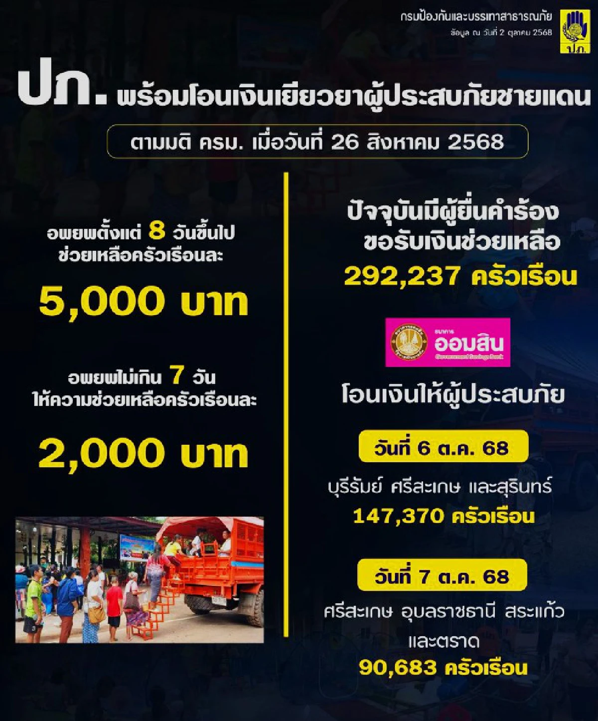 ความคืบหน้าการจ่ายเงินช่วยเหลือผู้ประสบภัยอันเนื่องมาจากการกระทำของกองกำลังจากนอกประเทศว่า ปัจจุบัน (ข้อมูล ณ วันที่ 2 ตุลาคม 2568) มีผู้ยื่นคำร้องขอรับความช่วยเหลือแล้ว 292,237 ครัวเรือน