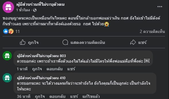 “ขออนุญาตนะคะเป็นเหมือนกันไหมคะ ตอนนี้ไม่กล้าบอกพ่อแม่ว่าเงิน กยศ. ยังไม่เข้าไม่มีตังค์กินข้าวเลย เพราะที่ผ่านมาก็หาตังค์เองด้วยรอ กยศ. ไปด้วย”