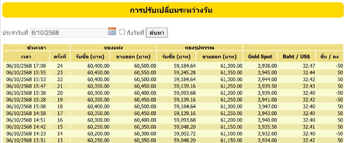 สรุปราคาทองวันนี้ (6 ต.ค. 68) โดย ราคาทองล่าสุด ราคาทองคำแท่ง ราคาทองคำรูปพรรณ ตลอดวันมีการปรับราคาขึ้น-ลง ดังนี้