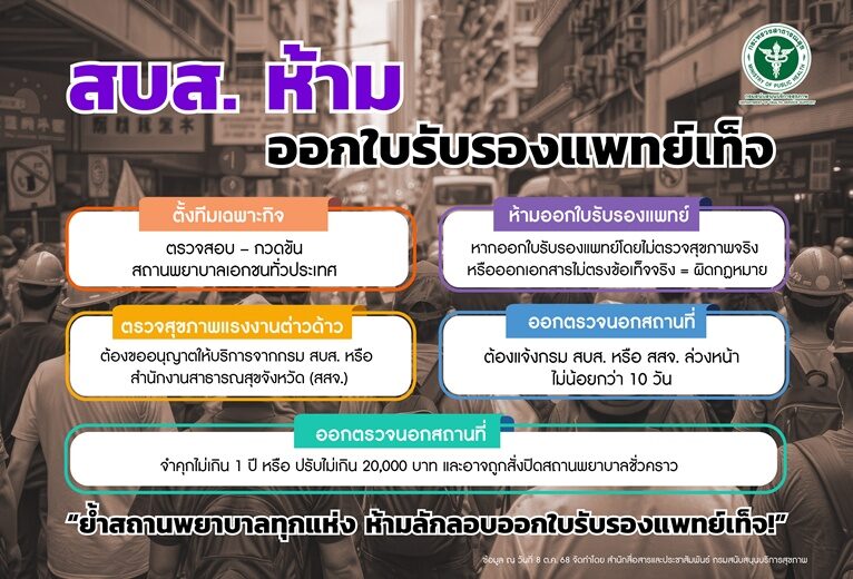 ที่มา : สบส.ตั้งทีมเฝ้าระวังสถานพยาบาลออกใบรับรองแพทย์ 'แรงงานต่างด้าว' ผิดกม.สกัดโรคระบาด