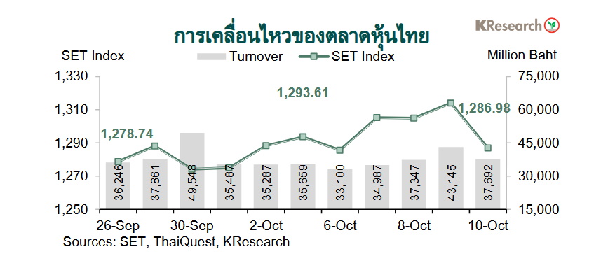 SET Index ปรับตัวลงช่วงต้นสัปดาห์ เนื่องจากไร้ปัจจัยใหม่ ๆ เข้ามาหนุน ประกอบกับตัวเลขเงินเฟ้อเดือนก.ย. ของไทยออกมาติดลบต่อเนื่อง ซึ่งทำให้มีความกังวลต่อความเสี่ยงของภาวะเงินฝืดเพิ่มขึ้น อย่างไรก็ดี SET Index ดีดตัวขึ้นมายืนเหนือ 1,300 จุด ในเวลาต่อมา ขานรับปัจจัยบวกจากรายงานข่าวเพิ่มเติมเกี่ยวกับมาตรการกระตุ้นเศรษฐกิจในประเทศ ประกอบกับมีแรงหนุนจากหุ้นกลุ่มผู้ผลิตชิ้นส่วนอิเล็กทรอนิกส์ตามทิศทางหุ้นเทคโนโลยีสหรัฐฯ