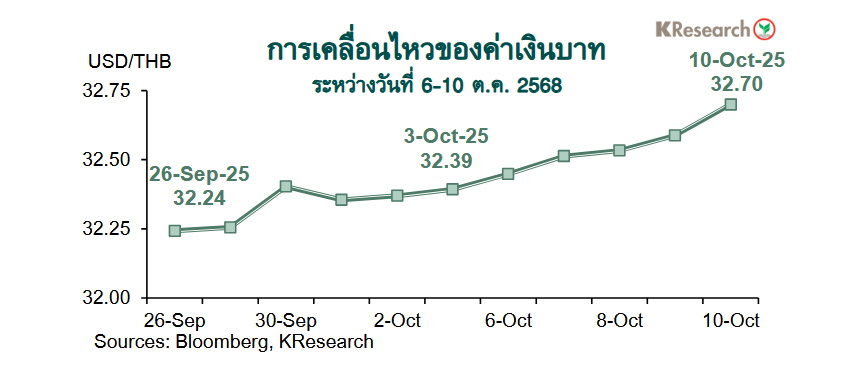 สำหรับสัปดาห์หน้า หรือระหว่างวันที่ 13-17 ต.ค. 2568 ธนาคารกสิกรไทยมองกรอบการเคลื่อนไหวของค่าเงินบาทที่ระดับ 32.50-33.00 บาทต่อดอลลาร์ฯ ขณะที่ศูนย์วิจัยกสิกรไทยประเมินปัจจัยสำคัญที่ต้องติดตาม ได้แก่ สถานการณ์ราคาทองคำในตลาดโลก ฟันด์โฟลว์ของต่างชาติ รวมถึงสถานการณ์ชัตดาวน์ของสหรัฐฯ และถ้อยแถลงของเจ้าหน้าที่เฟด