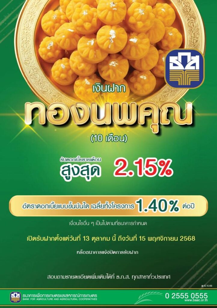ธ.ก.ส. เปิดตัวเงินฝากใหม่ทองนพคุณ ฝากขั้นต่ำครั้งละ 10,000 บาท รับดอกเบี้ยขั้นบันไดทุกเดือน สูงสุด 2.15% ต่อปี เฉลี่ยทั้งโครงการ 1.40% ต่อปี ระยะเวลาฝาก 10 เดือน เปิดรับฝาก 13 ต.ค.68 ถึง 15 พ.ย. 68