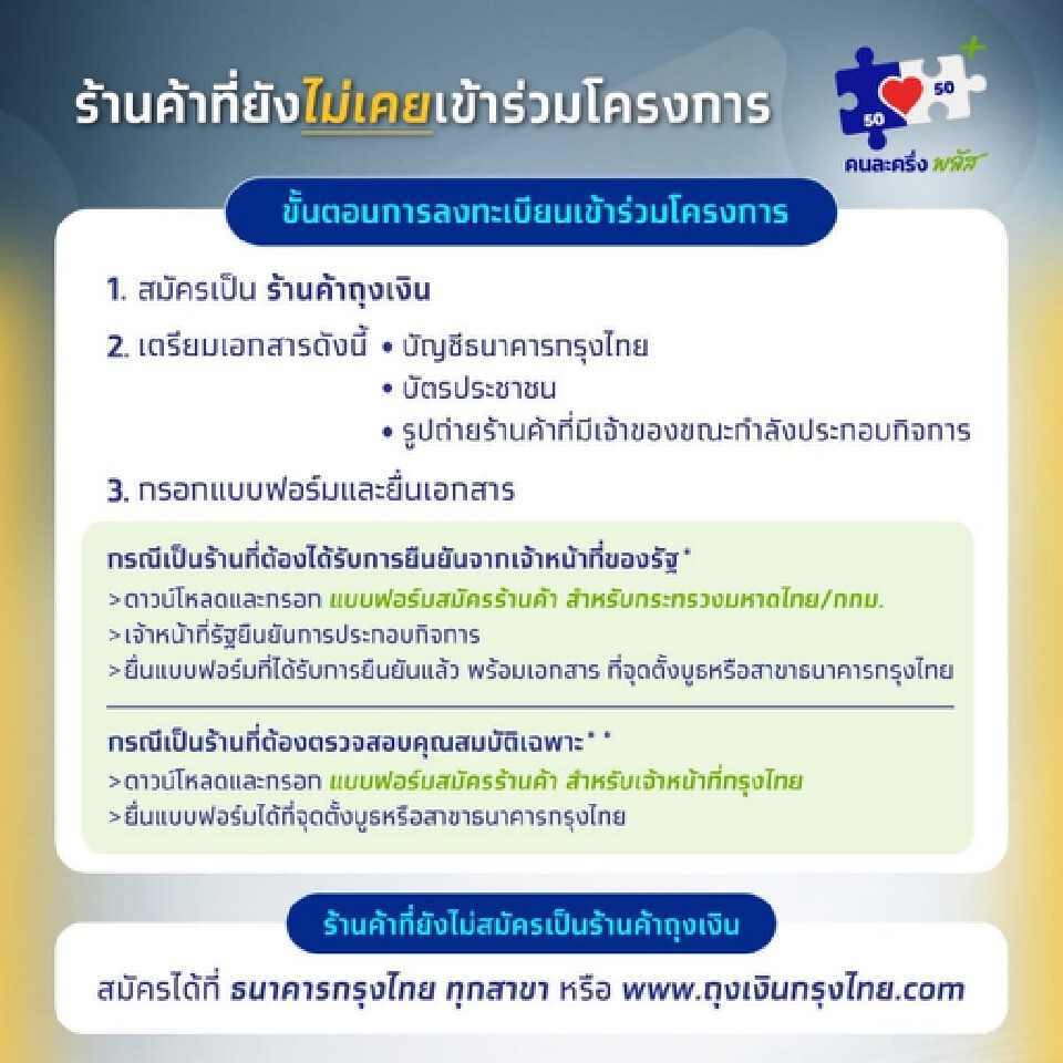 ส่วนร้านค้าที่เคยเข้าร่วมโครงการคนละครึ่งเฟส 5 และ ผ่านเกณฑ์ : ไม่ต้องลงทะเบียน (แค่เพียงอัปเดต แอปฯถุงเงิน และ กดยอมรับเงื่อนไขเท่านั้น)