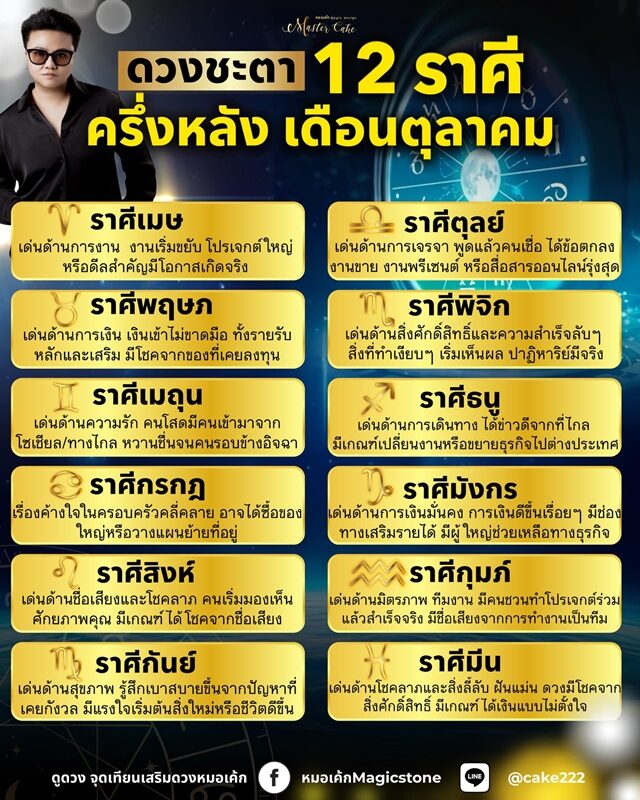 หมอเค้กดลบันดาล เปิดดวงชะตา 12 ราศี ครึ่งหลังเดือนตุลาคม เผย ราศีใดเด่นด้านการงาน เด่นด้านการเงิน โชคลาภ ราศีไหน เด่นด้านสุขภาพ โดยมีรายละเอียดของแต่ละราศีดังนี้