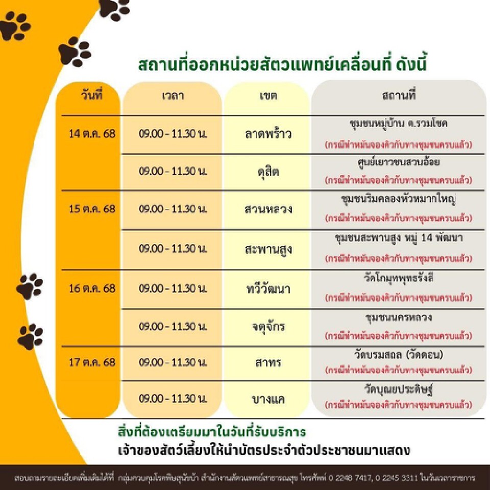 สำนักอนามัย กรุงเทพมหานคร ชวนฉีดวัคซีนป้องกันโรคพิษสุนัขบ้า, ฉีดไมโครชิป และทำหมันสัตว์เลี้ยง ให้บริการฟรีโดยหน่วยสัตวแพทย์เคลื่อนที่ซึ่งมีรายละเอียดและตารางสถานที่ออกหน่วยสัตวแพทย์เคลื่อนที่ ดังต่อไปนี้