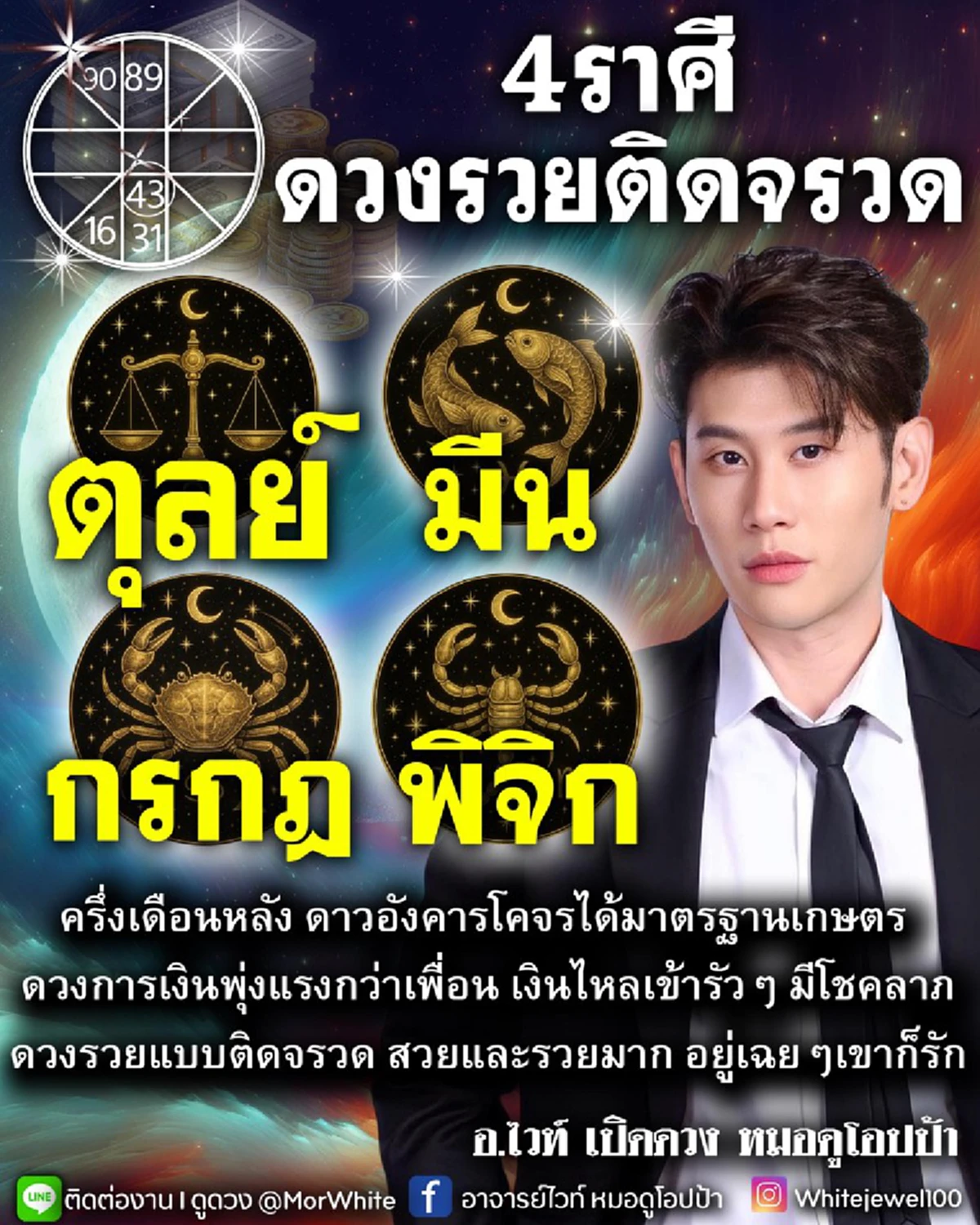 โดยวันที่ 15 ต.ค. 2568 เพจเฟซบุ๊ก อาจารย์ไวท์ หมอดูโอปป้า ได้เผยทำคำนายระบุว่า 4 ราศี รวยติดจรวด ครึ่งเดือนหลัง ดาวอังคารโคจรได้มาตรฐานเกษตร ดวงการเงินพุ่งแรงกว่าเพื่อน เงินไหลเข้ารัว ๆ มีโชคลาภ ดวงรวยแบบติดจรวด สวยและรวยมาก อยู่เฉย ๆ เขาก็รัก ซึ่งได้แก่