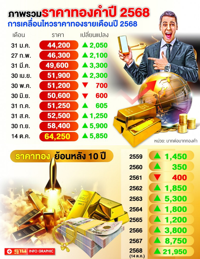 ราคาทองคำในประเทศปรับขึ้นอย่างร้อนแรง ทำสถิติสูงสุดเป็นประวัติการณ์อีกครั้ง โดย ณ วันที่ 14 ตุลาคม 2568 ทองคำแท่ง 96.5% (ขายออก) 64,200 บาทต่อบาททองคำ ทองรูปพรรณ (ขายออก) 65,000 บาทต่อบาททองคำ