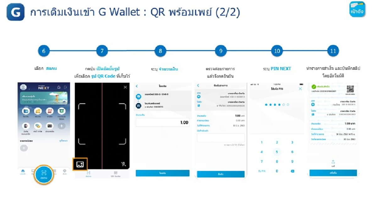 - การเติมเงินด้วย QR Code ผ่าน Mobile Banking ธนาคารต่างๆ สแกน QR พร้อมเพย์ จากเป๋าตัง G Wallet