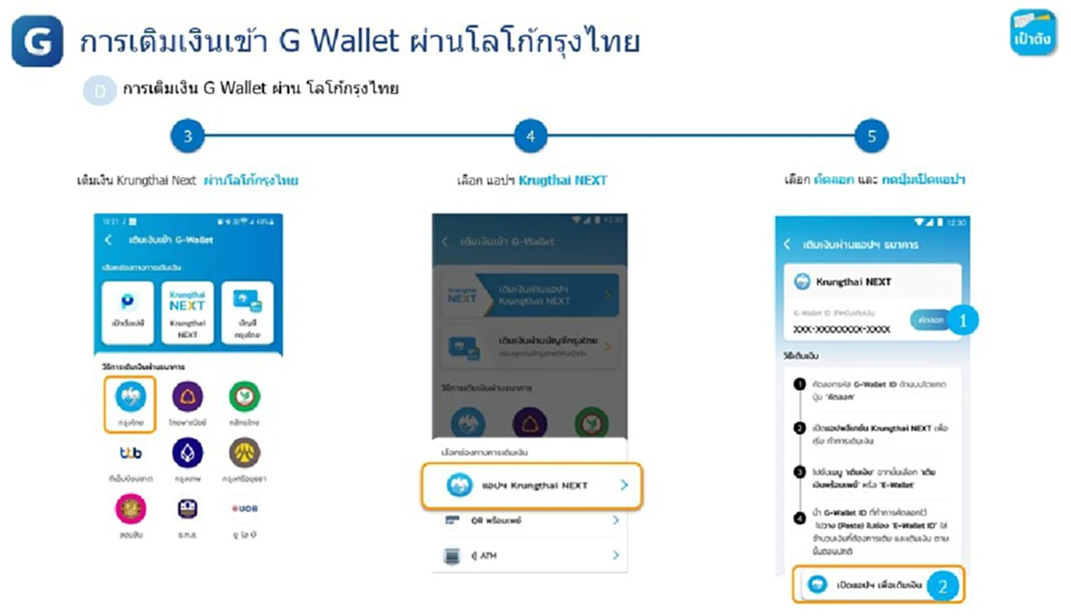 - การเติมเงิน G Wallet ผ่านบัญชีธนาคารกรุงไทย ไทยที่ผูกอยู่บนเป๋าตังง่ายๆ แค่มีบัญชีกรุงไทยและผูกบนเป๋าตัง