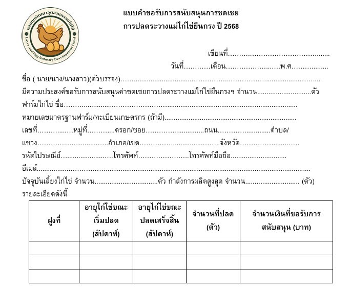 3. เริ่มปลดระวางไก่ไข่ออกจากฟาร์มตั้งแต่วันที่ 1 กันยายน - 31 ธันวาคม 2568 โดยยื่นแบบคำขอและเอกสารหลักฐานเพื่อขอรับเงินชดเชยได้ตั้งแต่ 31 ตุลาคม 2568 ถึง 15 มกราคม 2569