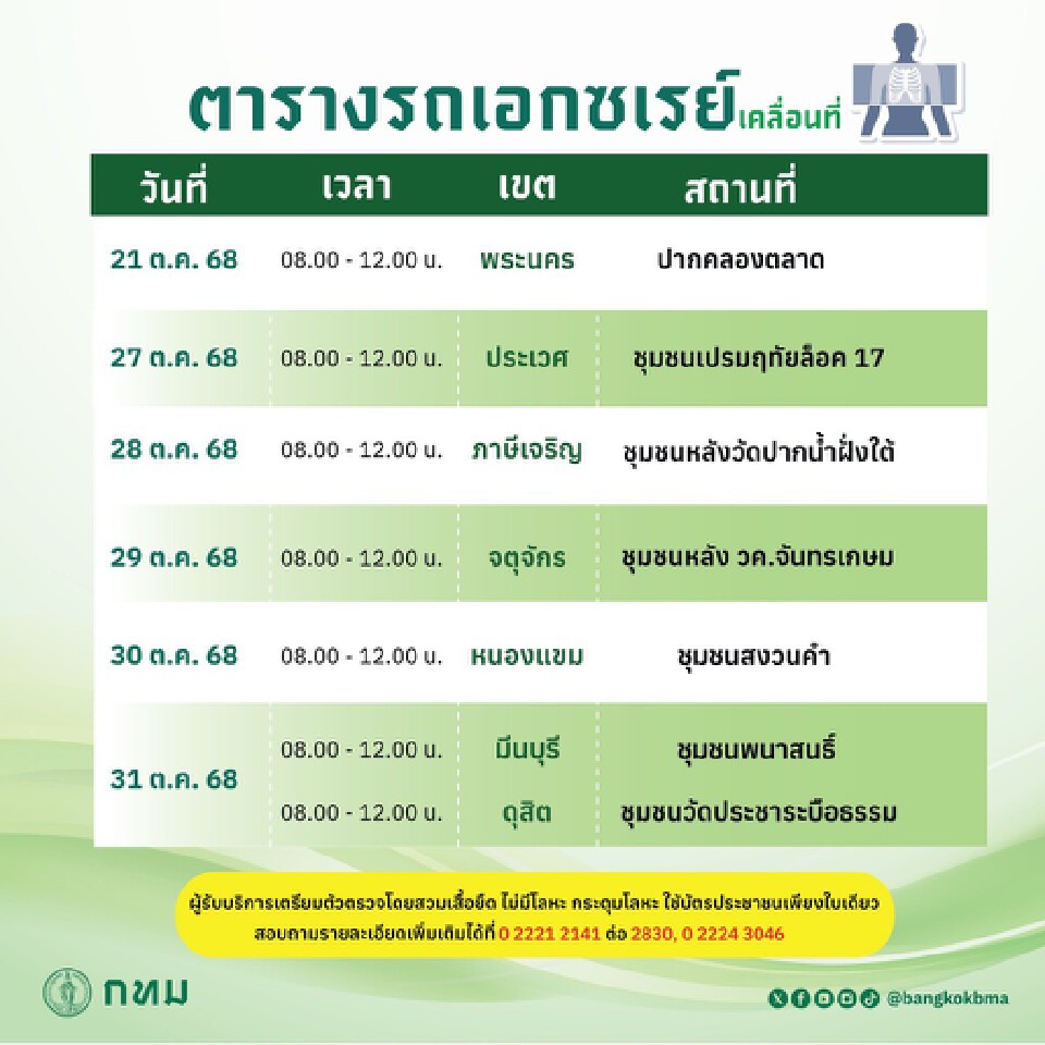 สำนักอนามัย กรุงเทพมหานคร เปิดตารางบริการออกตรวจรถเอกซเรย์เคลื่อนที่ประจำเดือนตุลาคม 2568 ระหว่างวันที่ 27-31 ตุลาคม 2568 มีที่ไหน เขตใดให้บริการบ้าง รวบรวมมาไว้ให้แล้วตามรายละเอียด ดังต่อไปนี้