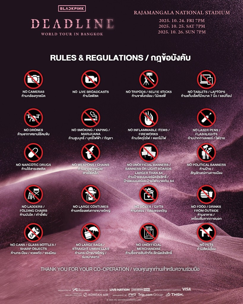 กฎข้อบังคับในการเข้าชมการแสดงคอนเสิร์ต BLACKPINK WORLD TOUR <DEADLINE> IN BANGKOK